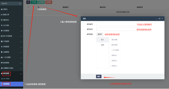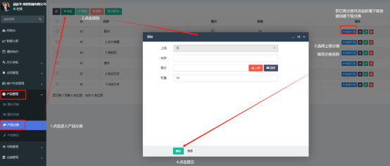 进入产品分类模块,点击新增,选择该分类的上级(为了更好区分整车与配件的分类,建议先创建整车与配件的分类),填写分类名称,点击确定就完成新分类的新建,若已有分类,可直接点击对应分类,直接新增下级分类。