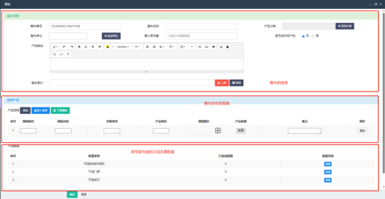 进入产品管理,选择整车产品,点击页面新增按钮,进入整车创建,在页面中填写车辆的基本信息与不同规格信息,填写好车辆信息后点击确认可保存车辆信息。