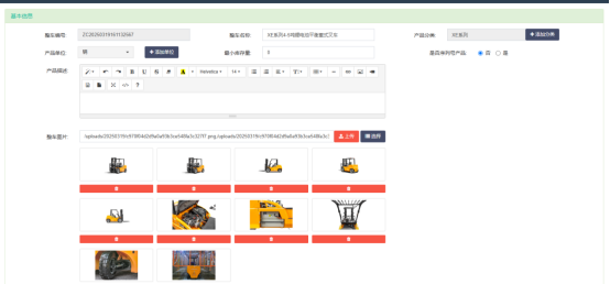 配件产品可以用于配件订单、售后服务、整车加配等功能,系统将记录配件的基本信息与不同规格信息,方便用户管理分类。