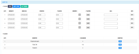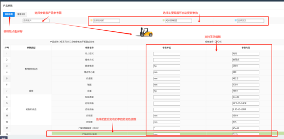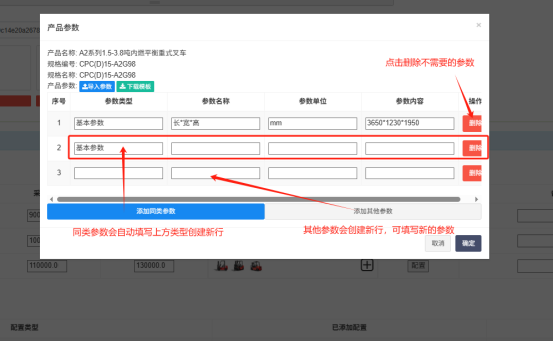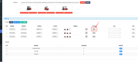 若需要导入车辆参数,需要在整车产品的新增页或编辑页面,点击需导入参数的车型规格,点击产品参数配置,进入产品参数配置页。