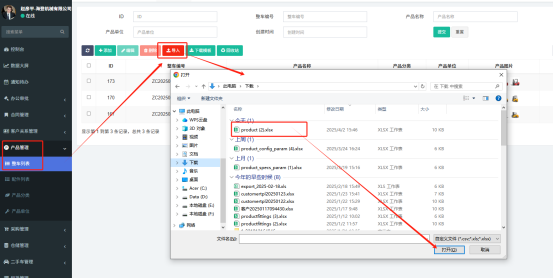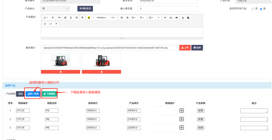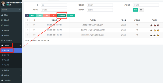 整车产品支持批量导入,在整车列表中点击下载模板,点击打开excel模板根据模板中提示填写信息,将需要导入的多个车辆信息填写并保存,之后点击整车列表的导入按钮,选择保存的模板文件上传,即可完成批量产品的创建。