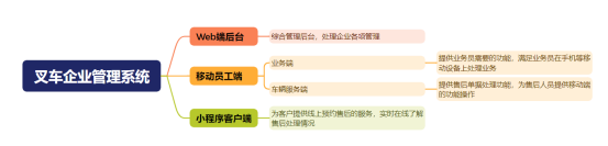叉车企业管理系统将分为3个服务端,分别是Web端后台、移动员工端、小程序客户端,分别为企业与企业客户提供对应的服务。Web端后台以网页模式为用户提供完整的企业管理功能,适合内部使用,全面管理;移动员工端分为业务端及车辆服务端,业务端提供给业务人员,可在外勤时通过手机完成业务操作,车辆服务端则提供给售后人员,完成外勤的相关业务操作;客户端小程序则提供给客户,线上预约售后服务等。