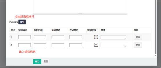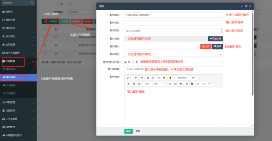 在产品管理中,选择配件产品,点击新增可开始创建配件,填写配件的基本信息与配件的不同规格信息,填写完毕后点击确认即可完成创建。