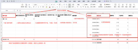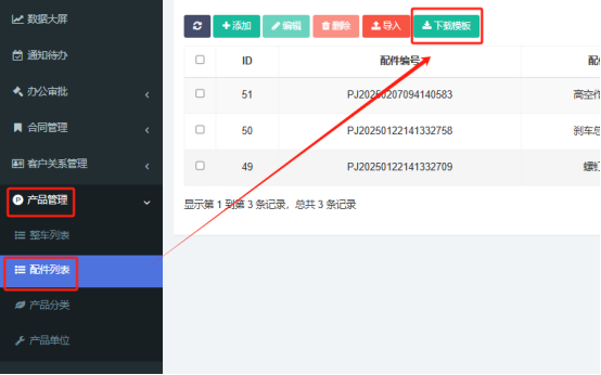 配件产品支持批量导入,在配件列表中点击下载模板,点击打开excel模板根据模板中提示填写信息,将需要导入的多个配件信息填写并保存,之后点击配件列表的导入按钮,选择保存的模板文件上传,即可完成批量产品的创建。