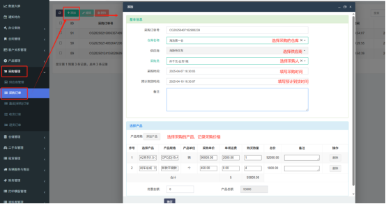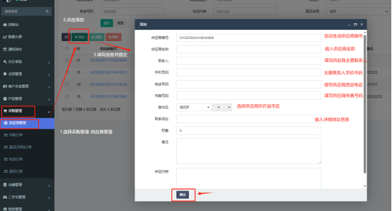 当需要向供应商采购时,可以联系供应商,之后记录采购单信息。
