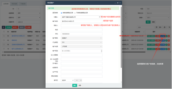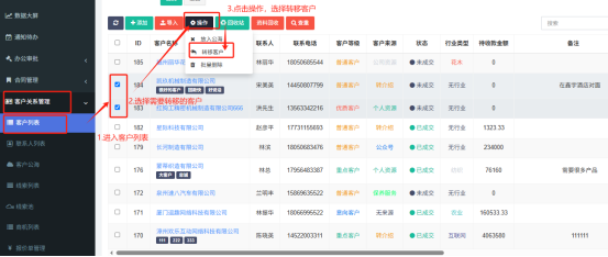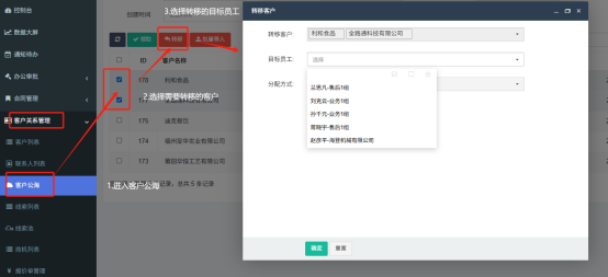 公海客户或客户列表的客户支持转移分配给指定员工用户,在客户列表或公海列表中选择需要分配的客户,点击转移,选择目标员工客户,点击确定即可完成客户转移分配。