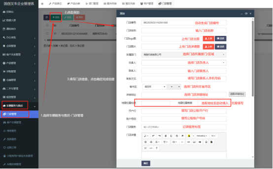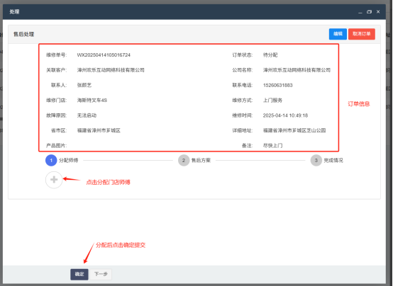 创建售后门店,添加售后师傅,与小程序关联用于售后。操作顺序为:创建门店-分配售后师傅。