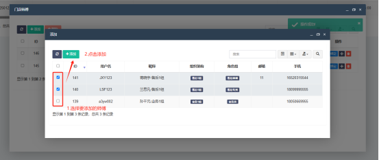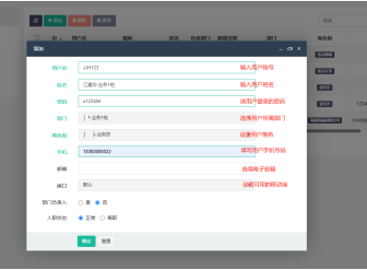 新增用户时,点击新增按钮,填写新增表单信息,包括用户登录使用的用户命(账号)、用户真实姓名,登录密码,对应账号使用人的身份选择此前创建的角色与部门,确认好信息,提交即可完成用户新增。