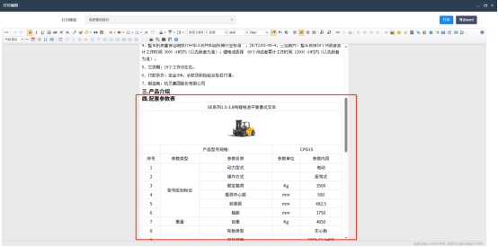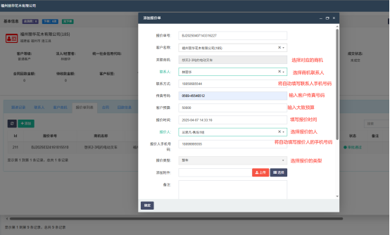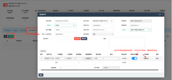 商机创建后,根据需要可以创建报价单。在客户画像中或客户关系管理中找到报价单管理,点击新增报价单,填写报价单信息,若报价类型为整车订单,且该整车产品有配置产品的参数信息,可开启参数表打印,在产品参数中点击编辑参数,选择对应配置自动更新参数,支持手动编辑,编辑完毕的参数表可在打印报价单时一同打印。