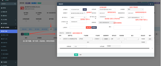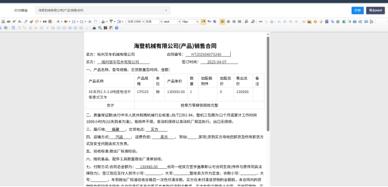 当和客户谈单顺利,客户进入签合同流程,可在系统中的客户画像-合同或合同管理创建合同,填写记录合同信息,通过关联商机和报价单可快速获取产品与价格信息,方便填写,降低出错。创建并保存好合同,审批通过生效的合同可模板打印与后续的回款操作。
