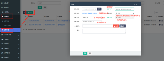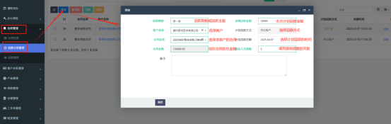 签订好合同后,当客户支付金额回款时,可以记录回款,同时回款信息可关联到业绩数据中,同时让自己了解客户的回款。可以与客户商定好回款时间与金额,创建回款计划,当时间临近时,系统可通知业务人员催款,回款后可选择回款计划完成回款,记录回款。