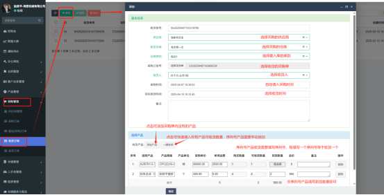 当采购的产品到货时,可创建采购收货单,关联采购单,并填写售后单信息,当收货单审批通过后,收货的产品将自动进入库存,更新库存数量。