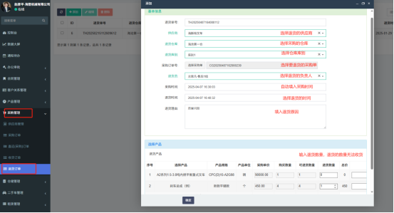 若到货的产品有问题或其他情况需要退货,可以填写采购退货单,关联采购单,记录退货产品情况。