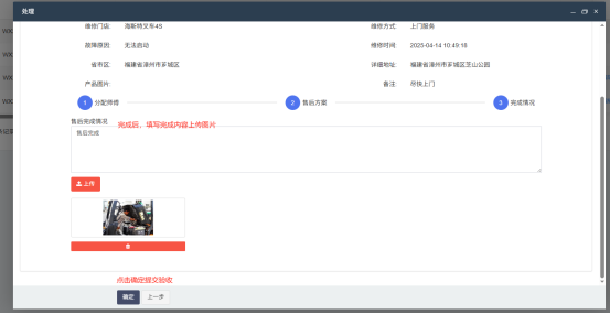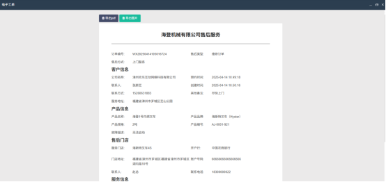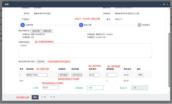 维修订单与售后订单处理流程一致,此处以维修订单为例。当客户提交订单后,点击订单操作的处理,进入处理界面,订单操作分为分配师傅-售后方案-完成情况,首先进入分配师傅界面,分配该订单的师傅,可分配多人,分配后点击提交,完成师傅分配,若用户指定师傅,可跳过分配阶段。点击处理,点击下一步进入售后方案,填写叉车检查结果或故障原因,点击添加售后项目,关联使用配件,设置配件价格与数量,填写工时费,提交方案,等待客户确认,若客户不同意方案,可与客户确认,修改方案再次提交。客户确认后可开始售后服务,服务完成可点击处理,下一步进入完成情况,输入完成的情况与图片,确认提交客户验收,客户验收完成,即可完成售后,若验收不通过,需与客户确认,完善售后,再次提交验收。订单完成后系统将自动生成售后工单,包含客户签字。