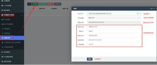 系统的售后将关联客户小程序,客户通过小程序下售后订单,门店方可收到订单提示,分配师傅处理订单。售后的主要业务处理在手机车辆服务端中,后台Web也可以处理相关服务。