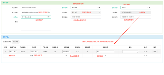 订单创建生效后,可以在库存管理-销售出库中,创建出库单,选择出库的仓库与需要出库的订单信息,系统将自动获取产品信息,填入出库数量,提交出库单。