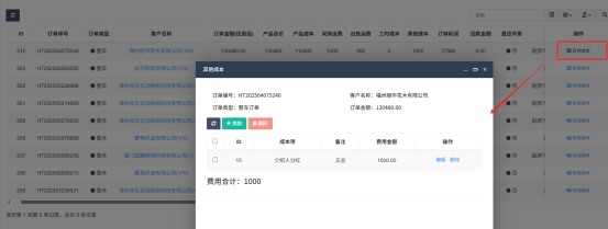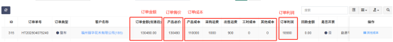 订单生效后,将在财务管理-订单汇总管理中生成订单信息,此处将获取订单的销售额及收入信息,通过销售出库可以将订单产品的成本信息汇总过来,计算订单利润,同时该模块支持自定义成本,将其他的成本数据手动添加进来,计算出准确的利润数据。
