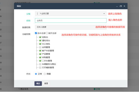 新增角色时,可选择直接新增或通过上级来新增下级,直接新增需要自选上级角色,通过其他角色新增下级会默认选择角色作为上级,选择上级后,新增的角色会继承上级的功能权限(最多只能选择上级角色的全部功能,无法超出上级的功能范围)。设置好上级角色后,输入本次创建的角色名称,选择该角色可查看的数据范围与可用功能,设置完毕后点击保存,完成角色的创建。